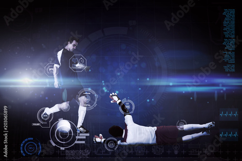 Football players tackling for the ball against blue dots on black background