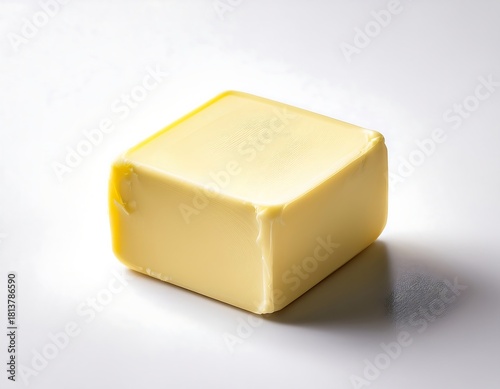 For a dairy product design, a single brick of butter is isolated on a white background.