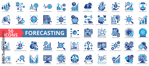Forecastingicon set flat style collection. Containing trend, analysis, data modeling, predictive analytics, market, demand, financial projection, risk, management.