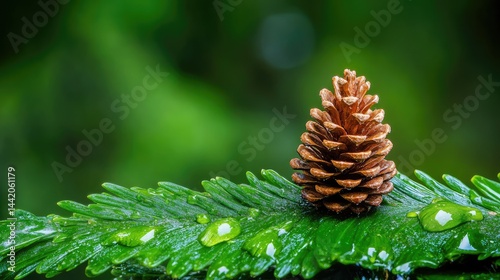 Forest ambiance with pine cone resting on damp green leaf, evoking freshness and tranquility