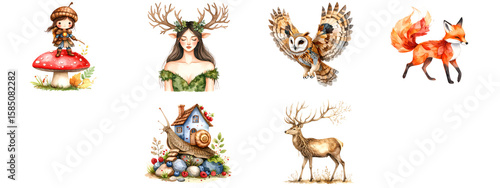 Forest animals, fairy, explorer girl and snail with mushroom house illustrations set on transparent background