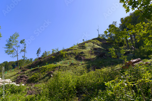Forest glade with idyllic landscape and fallen trees because of storm damages at City of Zürich on a sunny spring day. Photo taken May 18th, 2022, Zurich, Switzerland.