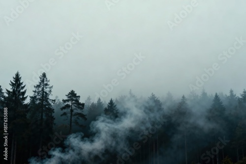 Forest Trees with Smoke in Misty Weather Creating Atmospheric Scenery