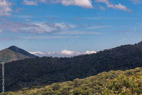 Forested Hills and Mountain Ridge Under Clear Blue Sky