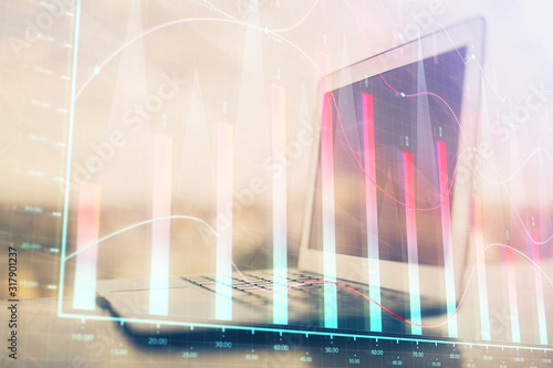 Forex Chart hologram on table with computer background. Multi exposure. Concept of financial markets.
