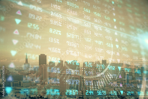 Forex graph on city view with skyscrapers background multi exposure. Financial analysis concept.