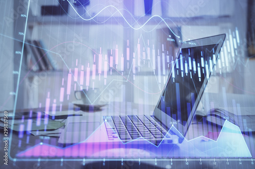 Forex market chart hologram and personal computer background. Double exposure. Concept of investment.