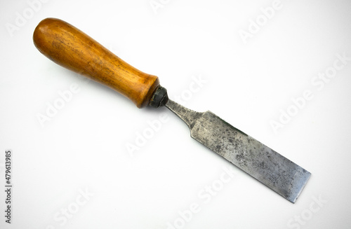 Forged chisel on wood on white isolate. An antique hand tool.