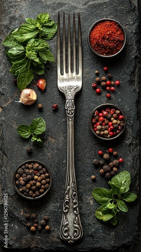 Fork with Spices and Herbs on Dark Stone Culinary Still Life