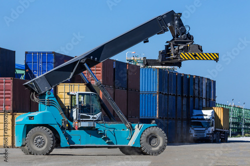 Forklift handling container box loading at the Docks with Truck