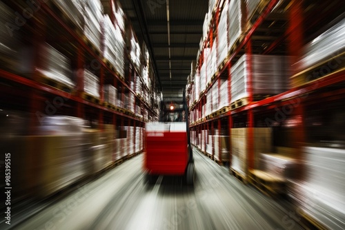 Forklift moving quickly through a warehouse with shelves full of boxes.