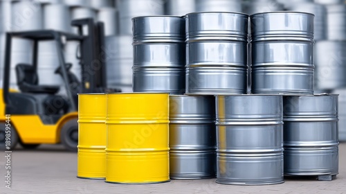 Forklift positioned near stacked yellow and silver barrels in a processing facility, showcasing industrial storage and material handling equipment