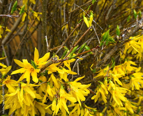 Forsythia in blossom shrub. Beautiful yellow flowers close up.