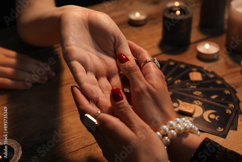 Fortune teller reading lines on woman's palm at wooden table, closeup. Chiromancy
