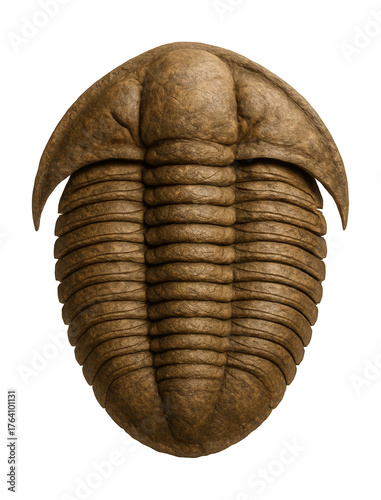 Fossilized trilobite shell featuring a segmented body and crescent-shaped head.