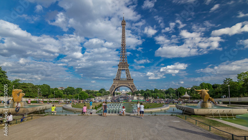 Fountains on famous square Trocadero with Eiffel tower in the background timelapse hyperlapse.