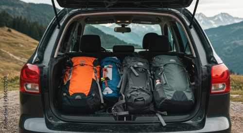 Four backpacks packed in the back of a black car ready for a mountain hiking adventure trip