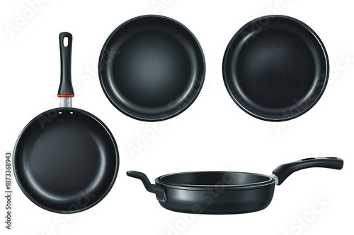 Four black non-stick pans are arranged on a transparent background for cooking and culinary use