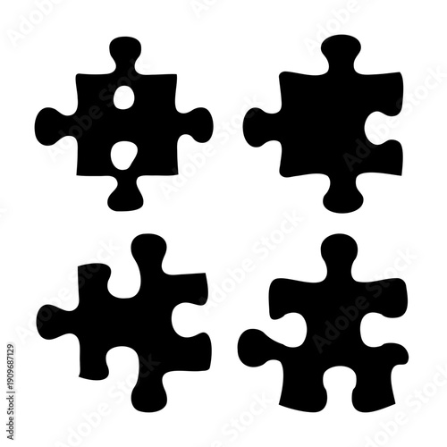 Four black puzzle pieces isolated on a white background symbolizing problem-solving and connection