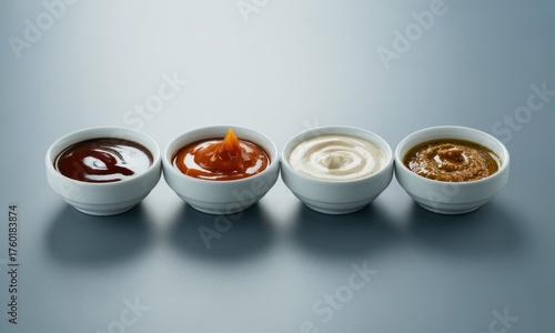 Four ceramic bowls with various sauces including barbecue, ketchup, mayonnaise, and mustard