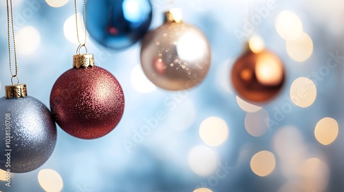 Four Christmas Ornaments Hanging Against a Blue and White Bokeh Background