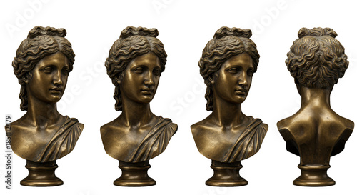 Four classical bronze busts of greek roman goddesses, wavy hair, serene expressions, polished aged patina, dark grey studio background; timeless classical art concept