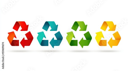 Four colorful recycle symbols in red, blue, green, and yellow, representing sustainability and environmental awareness.