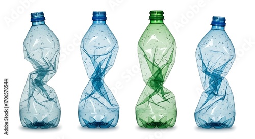 Four crumpled plastic water bottles, representing plastic waste and environmental pollution.
