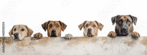 Four Curious Dogs Peering Over a White Wall, Generative AI