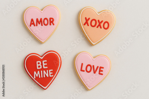 Four decorated heart cookies with love phrases like “AMOR” and “BE MINE,” arranged on a soft white background.