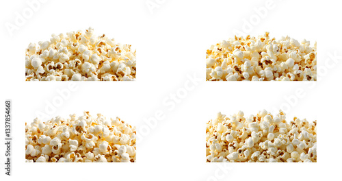 Four Distinct Piles of Popcorn Neatly Arranged on White Background. set