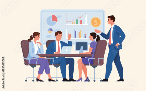 Four diverse business professionals collaborating during a meeting, analyzing financial charts and data on a large screen