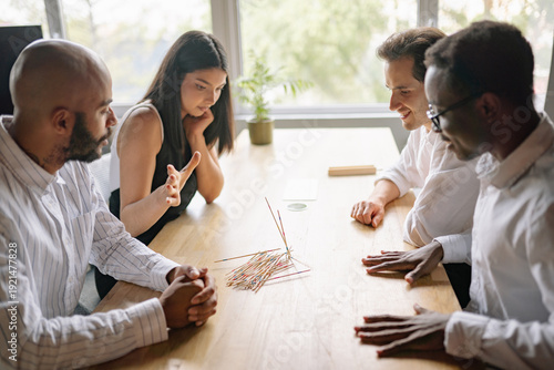 Four diverse colleagues gather around a wooden table, deeply focused on balancing sticks board game in a playful yet competitive activity, fostering teamwork and communication.