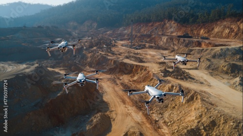 Four drones fly over a mountainous mining area capturing data for resource evaluation. The rugged landscape reveals extraction activities below highlighting technologys role in modern mining.