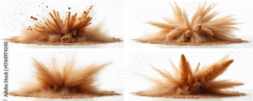Four dynamic explosions of brown dirt, sand burst outwards against clean white background. Powerful events create dramatic clouds, flying particles. Images show forceful impact scattering earth