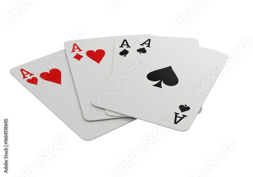 Four fanned ace playing cards (hearts, clubs, spades, diamonds) on a transparent background, soft studio light, concept of strategic excellence and achievement