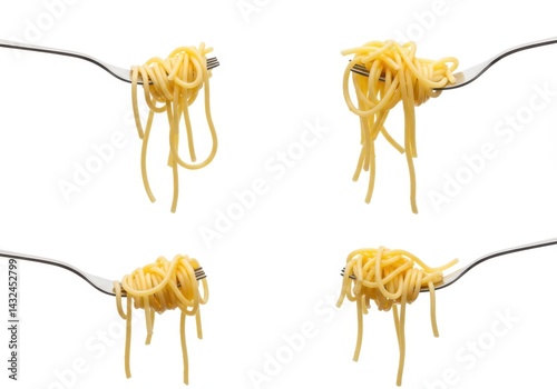 Four forks holding twirled spaghetti noodles against a stark white background in a square arrangement