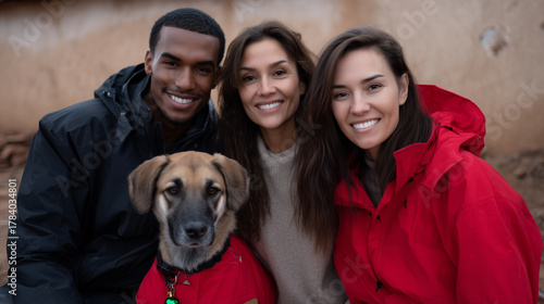 Four friends sitting close together with two dogs dressed in Christmas-themed outfits red coats and green collars with bells. They smile and laugh warmly, enjoying a cozy holiday m