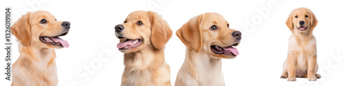 Four golden retrievers in various poses, showcasing their friendly expressions and well-groomed coats.