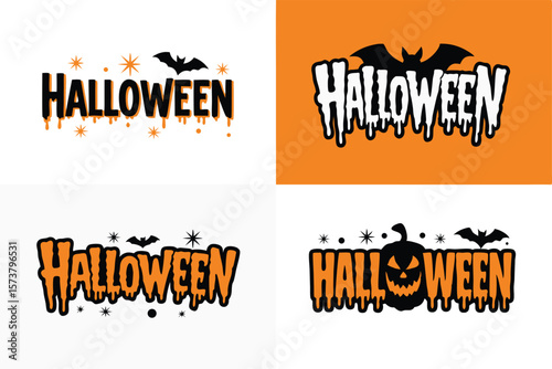 Four Halloween Word Designs with Bats, Stars, Pumpkin, Drip Effects, and Different Color Schemes