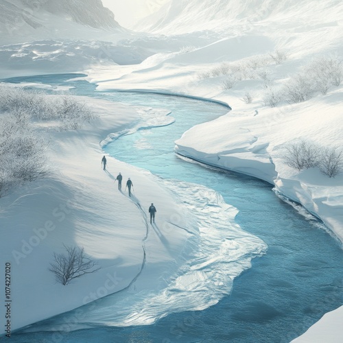 Four Hikers Traversing a Snowy Mountain Valley with a Winding River