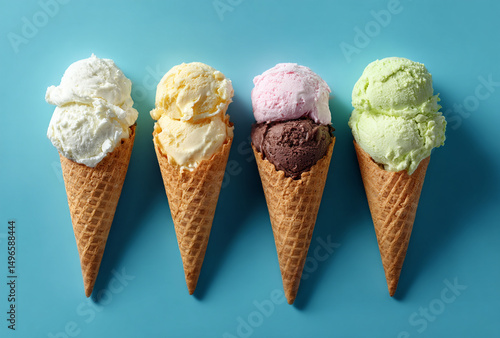 Four Ice Cream Cones with Assorted Flavors on Blue Background