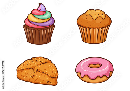 Four illustrations of baked sweet treats cupcake muffin pastry and donut