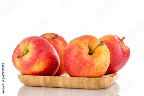 Four juicy red apples on a bamboo plate, close-up, isolated on white.