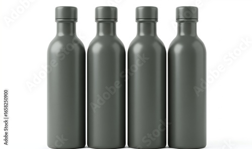 Four minimalist gray bottles standing in a row against a plain white background