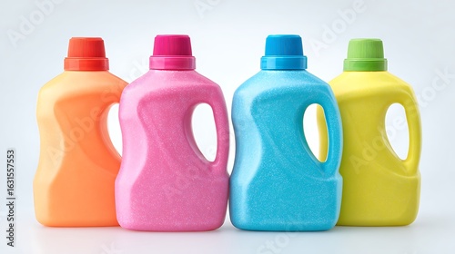 Four plastic laundry detergent bottles in orange, pink, blue, and yellow colors