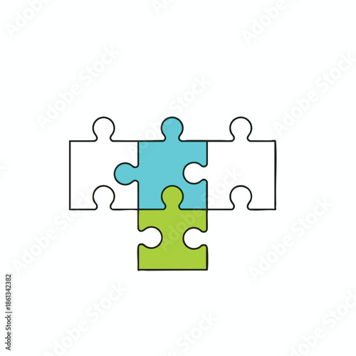 Four puzzle pieces, two white, one teal, one lime green, joined together