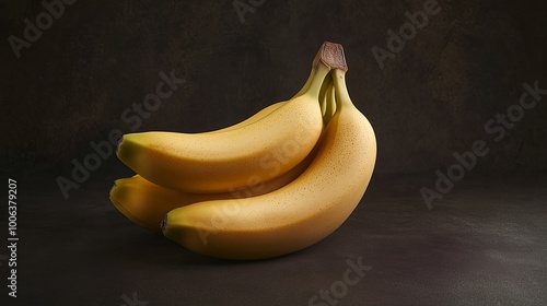 Four ripe yellow bananas arranged in a bunch on a dark rustic background.