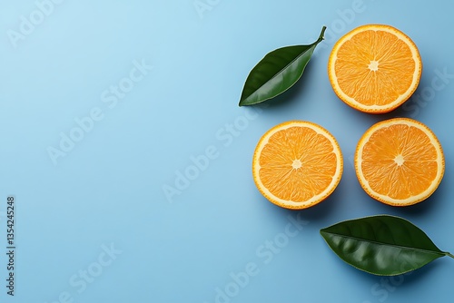 Four Sliced Oranges With Green Leaves Arranged On Blue Surface