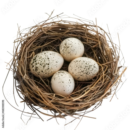 Four speckled eggs nestled safely in a cozy bird's nest waiting to hatch in spring